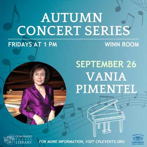 The Library’s Autumn Concert Series takes place on Fridays from September 5 to October 31. Each concert will begin at 1 p.m. in the Winn Room. Doors will open 15 minutes prior to the performance. On September 19, we will have Vania Pimentel on the piano.