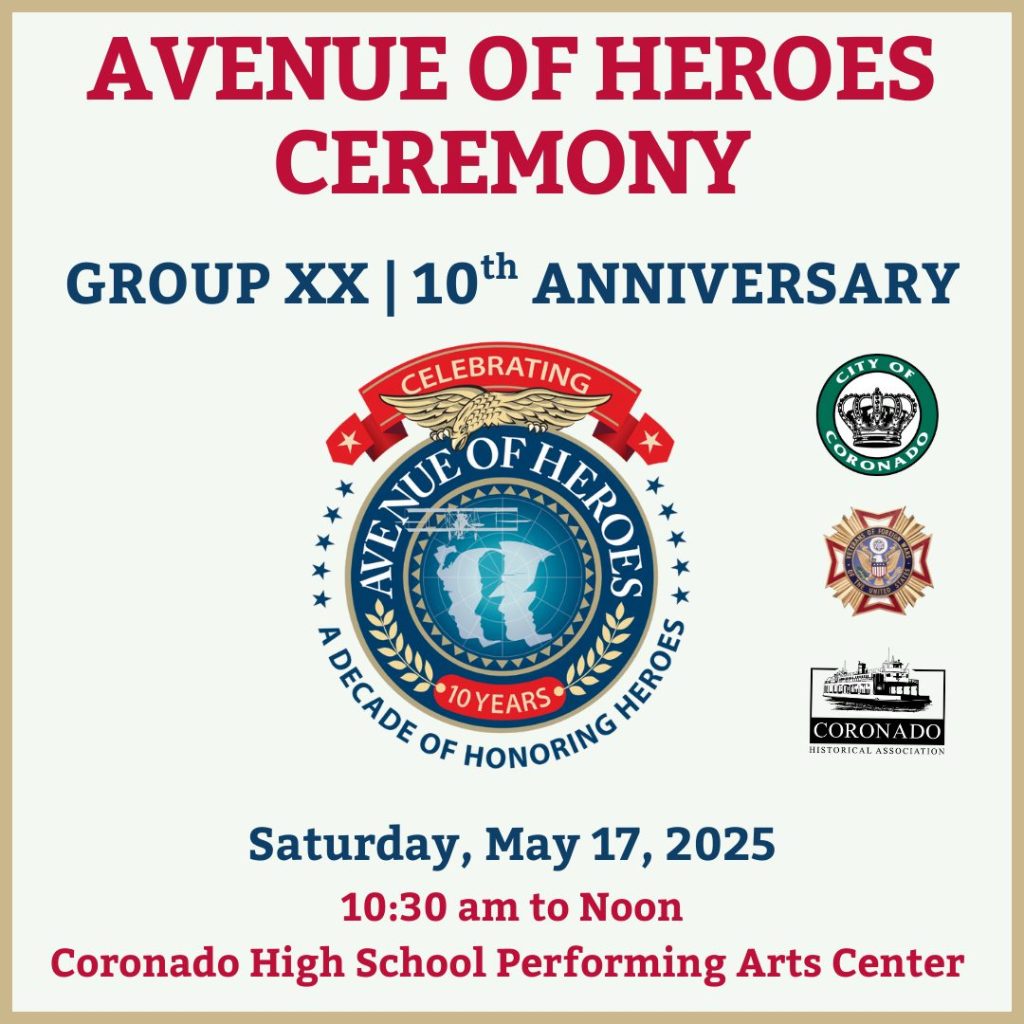 This year marks the 10th anniversary of the Avenue of Heroes program, which has recognized nearly 300 veterans and active-duty service members since its launch in 2014. The milestone ceremony will celebrate 16 new honorees – past or present residents of Coronado – who have honorably served their country.