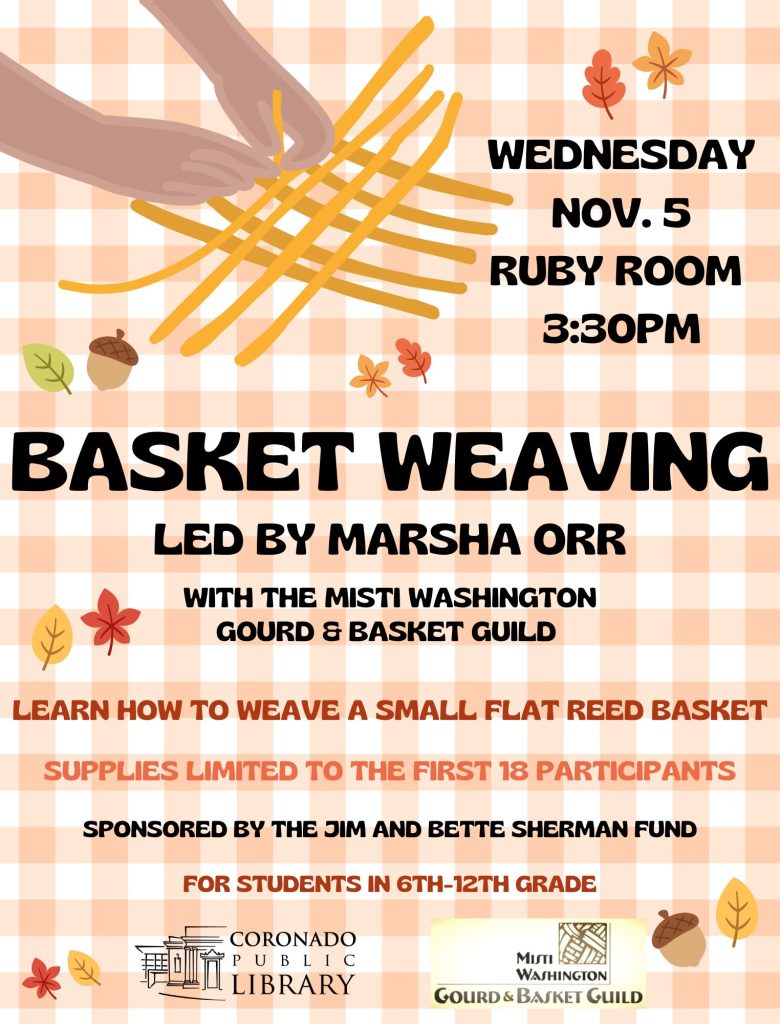 Learn how to weave a small, flat reed basket in this class taught by Marsha Orr of the Misti Washington Gourd and Basket Guild.