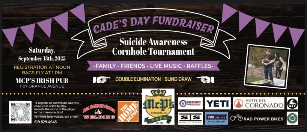 Cade’s Day is an event that was born from the loss of Cade’s life. A cornhole tournament is held twice a year, April in Phoenix and September in Coronado. The April event celebrates Cade’s birthday, and brings the community, family, and friends together to share stories, spread awareness and prevention resources, and have an afternoon of fun. The event in September brings the community together for prevention and awareness, particularly for the Military community, as well as prevention from the tragedy the Coronado Bridge may bring. There is live music along with the tournament, as well as exceptional raffles!
