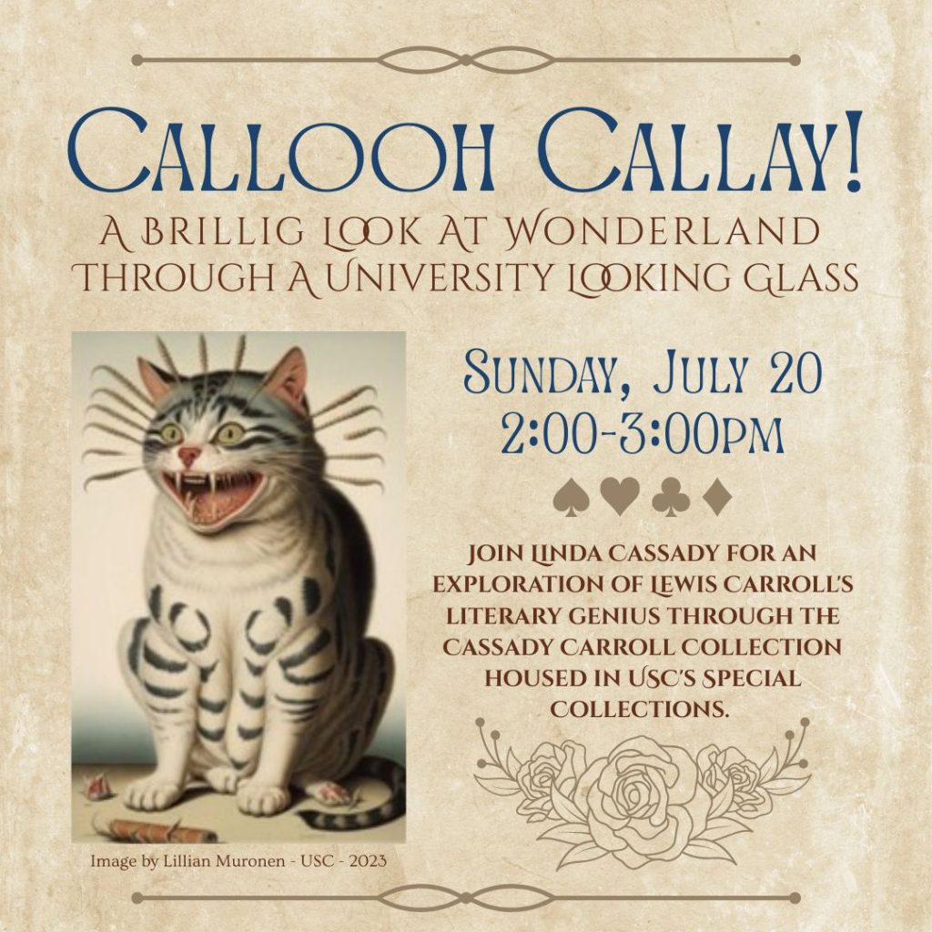 Join Linda Cassady for a journey into the literary wonderland of Charles Dodgson, better known as Lewis Carroll, through the treasured Cassady Carroll Collection of University of Southern California’s Special Collections. This engaging lecture explores how a remarkable book collection has inspired students to discover the genius behind Alice’s adventures, transforming some into artists in their own right. Discover the extensive works by and about Lewis Carroll housed in the USC Special Collections, and learn how an innovative Wonderland Award competition sparks the imagination of Southern California students as they pursue and rediscover Dodgson’s legacy. Come see how students tumble down their own rabbit holes of creativity, finding Alice in the wonderland of their own imaginations through art, literature, and scholarly exploration.