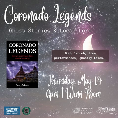 What secrets linger beneath Coronado’s sunny shores? Discover them at the launch of Coronado Legends, a captivating collection of local ghost stories and mysteries written by David J. Schmidt. From the haunting legend of Kate Morgan at the Hotel del Coronado to eerie tales of poltergeists, haunted hotels, and even our own haunted library, it shows a side of Coronado’s past not all might know!