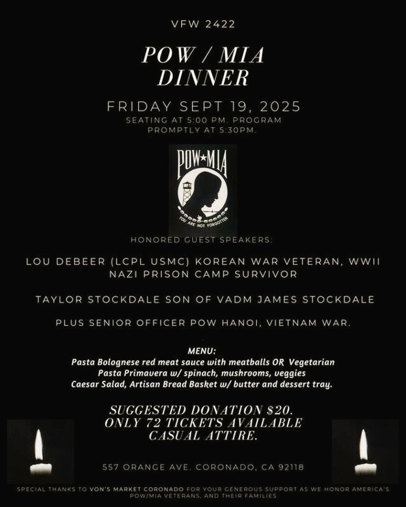The Coronado VFW Post 2422 invites the community to its Annual POW/MIA Dinner on Friday, Sept. 19. The evening is organized by the Post with the support of VFW Auxiliary volunteers.