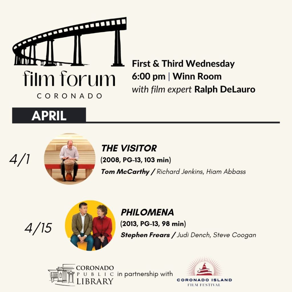 Coronado Public Library, in partnership with the Coronado Island Film Festival, presents FILM FORUM CORONADO, taking place the first and third Wednesday of each month at 6 p.m. in the library’s Winn Room. Film expert Ralph DeLauro provides a brief introduction to each film and leads a discussion afterwards, often including pointers about how lighting or camera angles contribute to a scene’s mood or propel the story.
