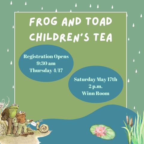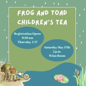 Frog and Toad extend an invitation to the Coronado Public Library’s annual Children’s Tea! Enjoy an afternoon with lunch, surprises, and a photo booth at the library. Families of all shapes and sizes are welcome to enjoy the swampy snacks.