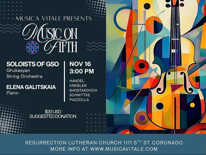 Described as “virtuosic and exhilarating, passionate and deeply moving,” the first performance of Coronado’s newest chamber concert series, Music on Fifth, was a standout success. Continuing the trend, its second performance on Sunday, November 16 at 3 pm, promises more excitement with compositions by Handel, Astor Piazzolla, Fritz Kreisler, Dmitri Shostakovich, and Alfred Schnittke. Located at Coronado’s Resurrection Lutheran Church, 1111 5th St., the concert is free, though donations are appreciated.