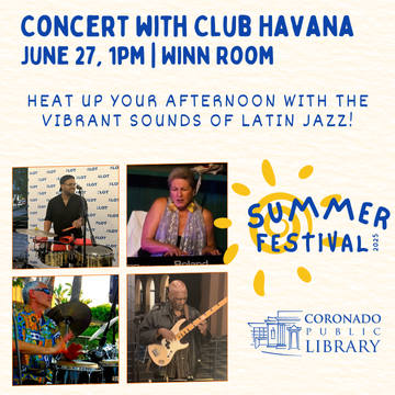 Heat up your afternoon with the vibrant pulse of Latin jazz when Club Havana takes over the Coronado Public Library’s Winn Room! Powered by the globe-spanning lineup of Ignacio Arango (Cuba) on bass, Yasser Cruz (Cuba) on timbales, Robert Felcher (New York) on congas, and the brilliant Turiya Mareya (Tijuana) at the piano, the group melds fiery Afro-Cuban rhythms with sleek modern harmonies. A critically acclaimed composer and one of Southern California’s most innovative—and criminally underrated—artists, Mareya will lead the band through her own genre-bending originals alongside beloved Latin-jazz standards, weaving funk, tradition, and avant-garde sparks into an irresistibly dance-worthy set. Admission is free, the vibe is electric, and the music is guaranteed to transport you straight to a sultry Havana night—come catch the groove!