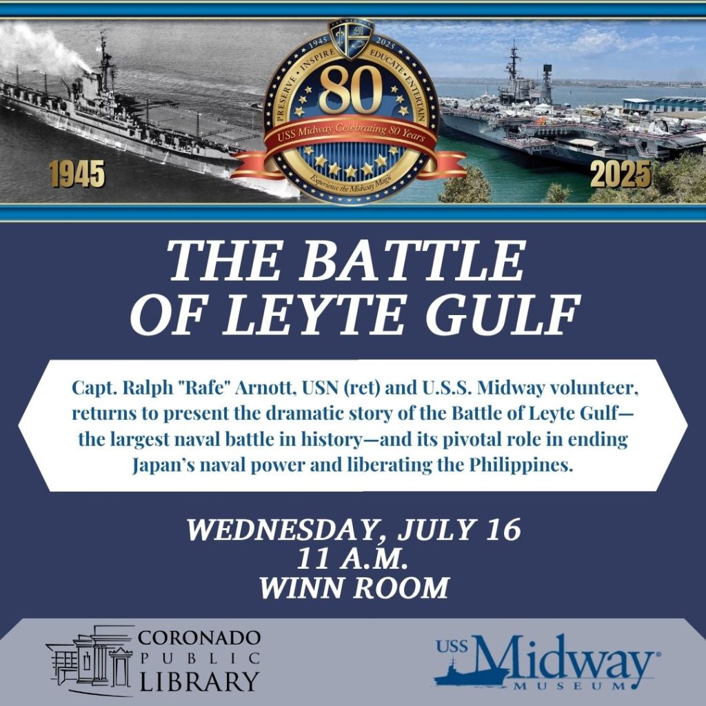 Join us for a compelling presentation on the Battle of Leyte Gulf—the final major fleet operation of World War II and the largest naval battle in history. Spanning over 100,000 square miles and involving nearly 300 ships, this epic conflict resulted in the loss of 26 vessels and more than 400,000 lives.