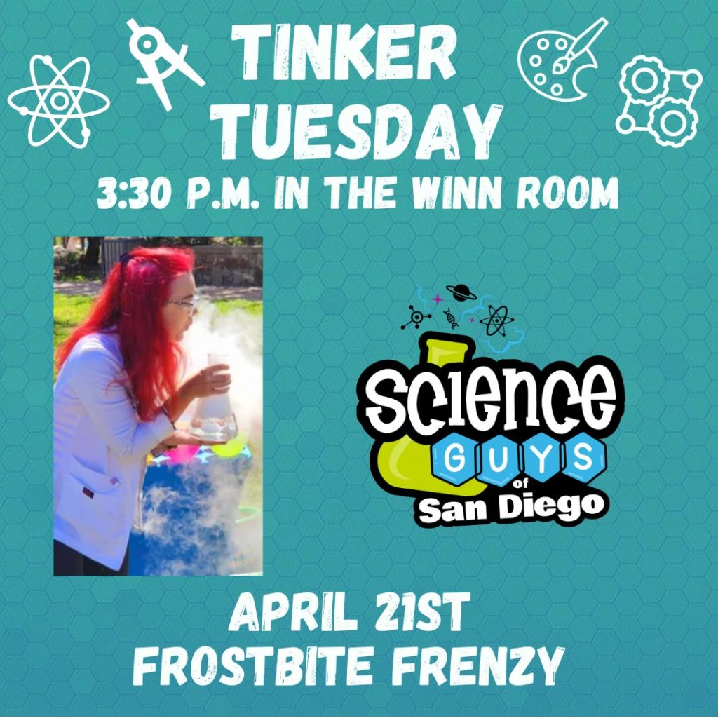 Tinker Tuesday presents: The Science Guys of San Diego! Come explore pressure and states of matter, with dry ice as the star of the show. Kids will go crazy for the insane cup popper and dry ice bubbles. Learn about sublimation and increasing pressure, ending with silly explosions.