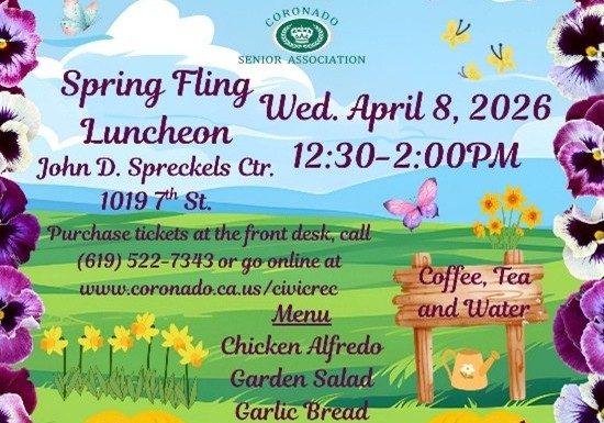 The Coronado Senior Association starts their popular luncheon events for 2026 with a “Spring Fling Luncheon” on Wednesday, April 8 from 12:30 to 2 pm in the Grand Room of the John D. Spreckels Center. Volunteers will be serving...