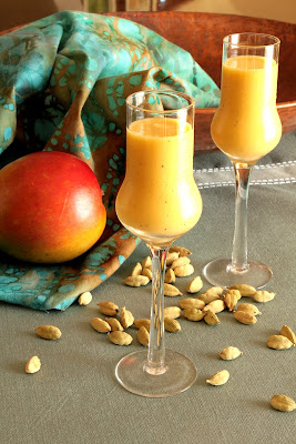 The chicken is first marinated overnight in Masala Marinade, then skewered and grilled John also poured small glasses of Mango Lassi, a popular and traditional yogurt-based drink. There are many versions. John made some slight modifications to Andrea’s recipe at Cooking Books, here, and then put the lassi in the ice cream maker to make it the consistency of frozen yogurt. By the time we were ready for a glass, it had thawed to a perfectly chilled and sippable smoothie.