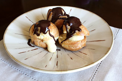 Our menu also included Cynthia’s Beet Salad, with Peas and Cucumber; Madeleine’s Double Chocolate Brownies; and Rich’s Potato Pierogi, which he proudly proclaimed were steamed over vodka. I wonder if that would be considered alcohol abuse? I’ve been wanting to make Pierogi for some time, and am now even more inspired. This recipe from Smitten Kitchen looks tasty. Since John was the featured Russian chef in our kitchen this week, I decided to try my hand at Profiteroles with Coffee Pastry Cream & Black Russian Chocolate Sauce. These were surprisingly easy to make. I transported the Profiteroles to the park in Tupperware, with my own pastry bag filled with pastry cream and squeeze bottle filled with Kahlua-Vodka sauce.