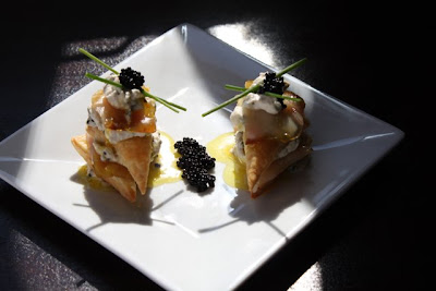 John had everything organized to make assembly of his Napoleons a breeze: Freshly baked Puff Pastry triangles neatly stacked in a Tupperware container, Caviar Cream carefully spooned into a pastry bag, Lemon Gastrique poured into a squeeze bottle, smoked sturgeon cut to fit the Puff Pastry triangles, and extra caviar and chives for garnish.