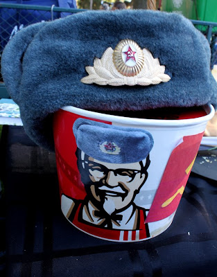 Sparks hopelessly attempted to disguise the Colonel on her ubiquitous bucket of Kentucky Fried Chicken… You can lead the girl to the kitchen, but you can’t make her cook!