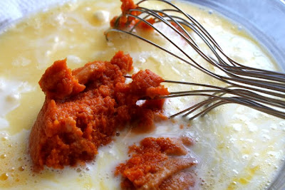 In a large bowl, whisk 4 eggs until blended. Then, whisk in 1 cup milk, 1 cup buttermilk, 1 cup canned solid-packed pumpkin, and 6 tablespoons butter (melted) until smooth.