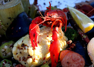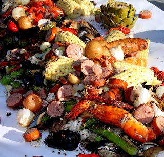 Although the Summer Concerts in the Park season just ended, we decided to return to the Park last night for a little After-Party, which we nicknamed Jubilee. The conditions were ideal: A warm summer evening, near-empty park, breeze blowing through the trees, a group of friends, and our own bountiful harvest of seafood and vegetables. It was an old-fashioned, eat-with-your-hands kind of dinner that we all enjoyed tremendously.