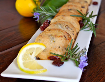 Spring has sprung! These cookies were inspired by a variety of sources, including our rosemary bush covered with purple flowers and an overabundance of lemons on Jim & Melinda’s lemon tree. I’ve seen shortbread cookies incorporating lemon and thyme, strawberries and thyme, and lavender, so I wondered how a combination of dried cherries, fresh rosemary, and lemon zest would taste. Let’s just say I’ve found it hard to resist the crumbly shortbread, chewy cherries, zing of lemon, and a slight hint of rosemary on the finish.