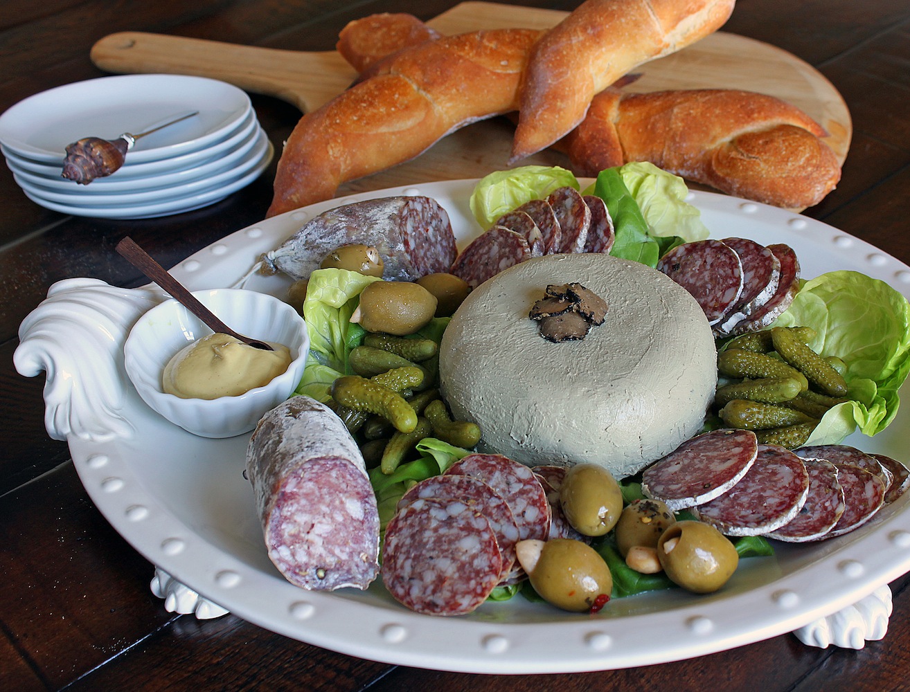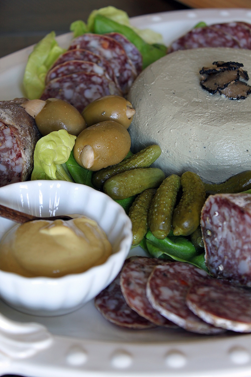 The recipe I used is really a breeze to put together and is so creamy and smooth with the cream cheese. Laced with Armagnac or cognac, bits of black truffle, and presented on a platter with dry-cured sausages, olives, and cornichons, it makes a beautiful presentation for a cocktail party or, as in our case, gourmet picnic in the park!