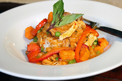 John and I devoured the leftover Duck with Red Curry for dinner tonight. We added some roasted chicken, sweet potatoes, onions, red bell peppers, and peas, and served it over rice. On the spice scale, this is a 7/10. You can reduce the curry paste to 2 tablespoons if you’re a bit timid. We like it hot, baby!