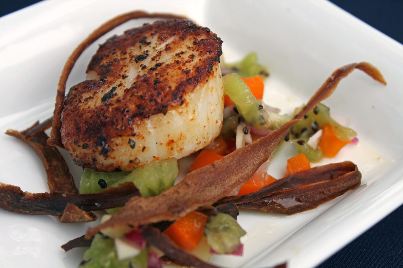 I’ll begin with Kai’s Rewena paraoa (potato bread), since kai is the Maori word for food. Nigel Olsen, author of Curious Kai, The Curious New Zealand Food Blog, dedicates three posts to the preparation of this bread, with the complete recipe and step by step photos. The first post starts here. Our Kai served two loaves, still warm from the oven, with garlic butter…we were very impressed that he went through the 3-day process to make this flavorful bread! Kai also served Grilled New Zealand Lamb Chops, but discouraged my photo shoot because they were served on one of Max’s monkey plates 😉