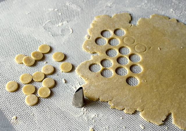 To make the garnish, dough scraps are rolled out and cut into grape and leaf shapes.