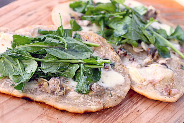 I added some fresh mozzarella to mine, and a little arugula salad dressed with olive oil and lemon, on top. For the crust, I used Jim Lahey’s No-Knead Pizza Dough, and I adapted Mario Batali’s White Clam Pie and Food Network’s White Clam Pizza recipes for the topping.