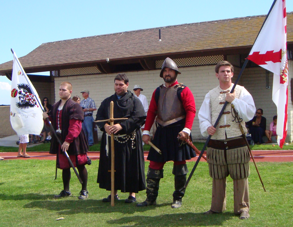 He was rowed by sailors in red caps. He looked: serious, very hot in his armor and tough when he came ashore. He put two flags from his helpers and a cross from his pastor in the sand. U.S. Navy sailors then put out the flags and played the national anthems of Mexico, Portugal, Spain, and the United States of America. They also put out the Indians of San Diego flag but the Indians did not have an anthem. However, they did Indian dances. There were also Portuguese
