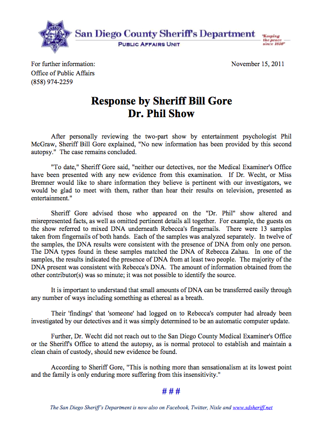 Sheriff Bill Gore Responds to Dr. Phil Rebecca Zahau Episode – Case Remains Concluded