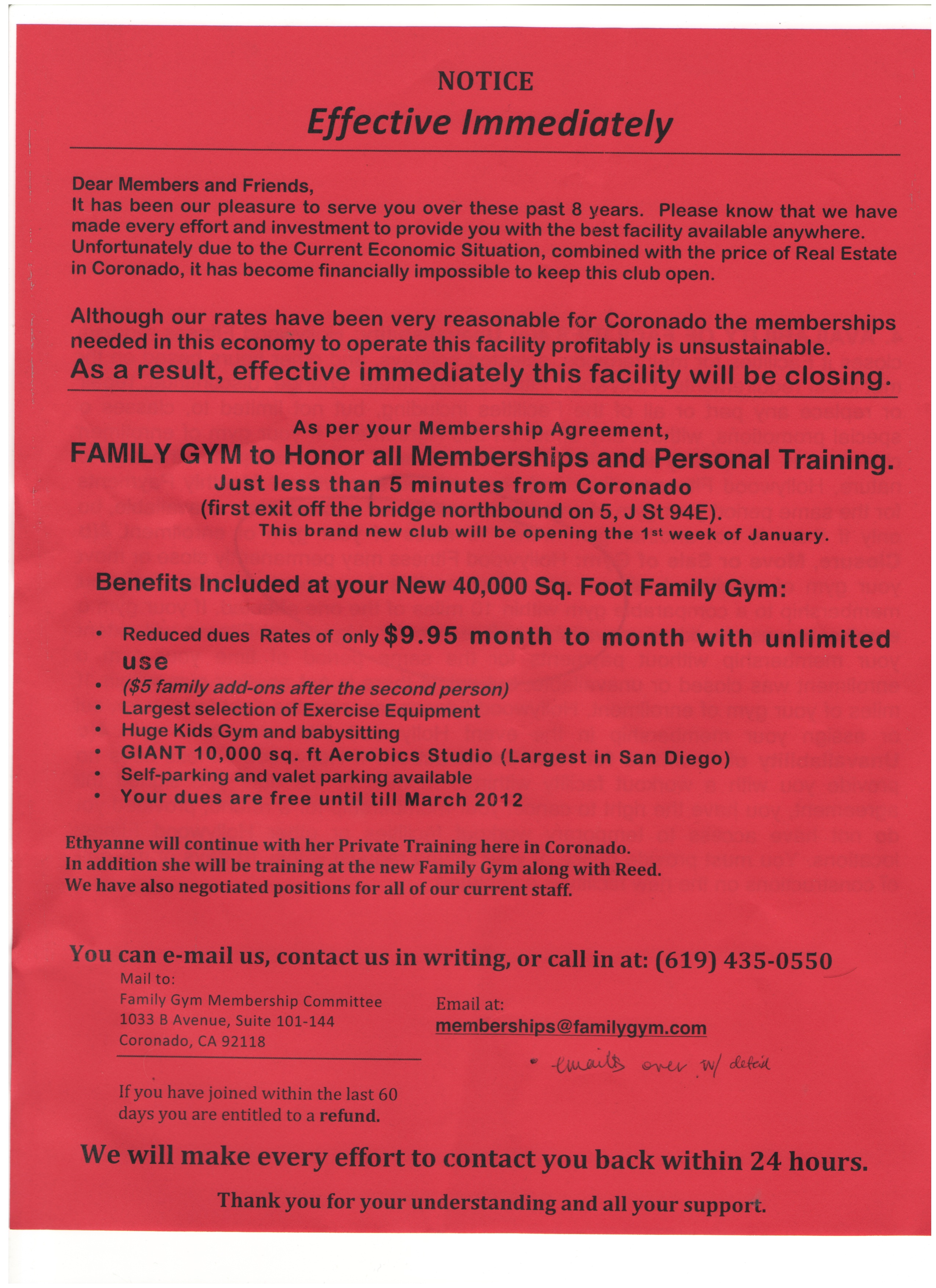 – Less than 6 months later, the facility is moving. Those who have signed up for membership in the last 2 months, are eligible for a full refund. Those who signed up prior to 2 months ago, are meant to write an email (as seen on the red sheet) stating your case, however, there is a clause that states that so long as a new facility is within 10 miles of the current one, your membership stays and will be transferred. The new facility is 4 miles from its current one but requires members to drive.