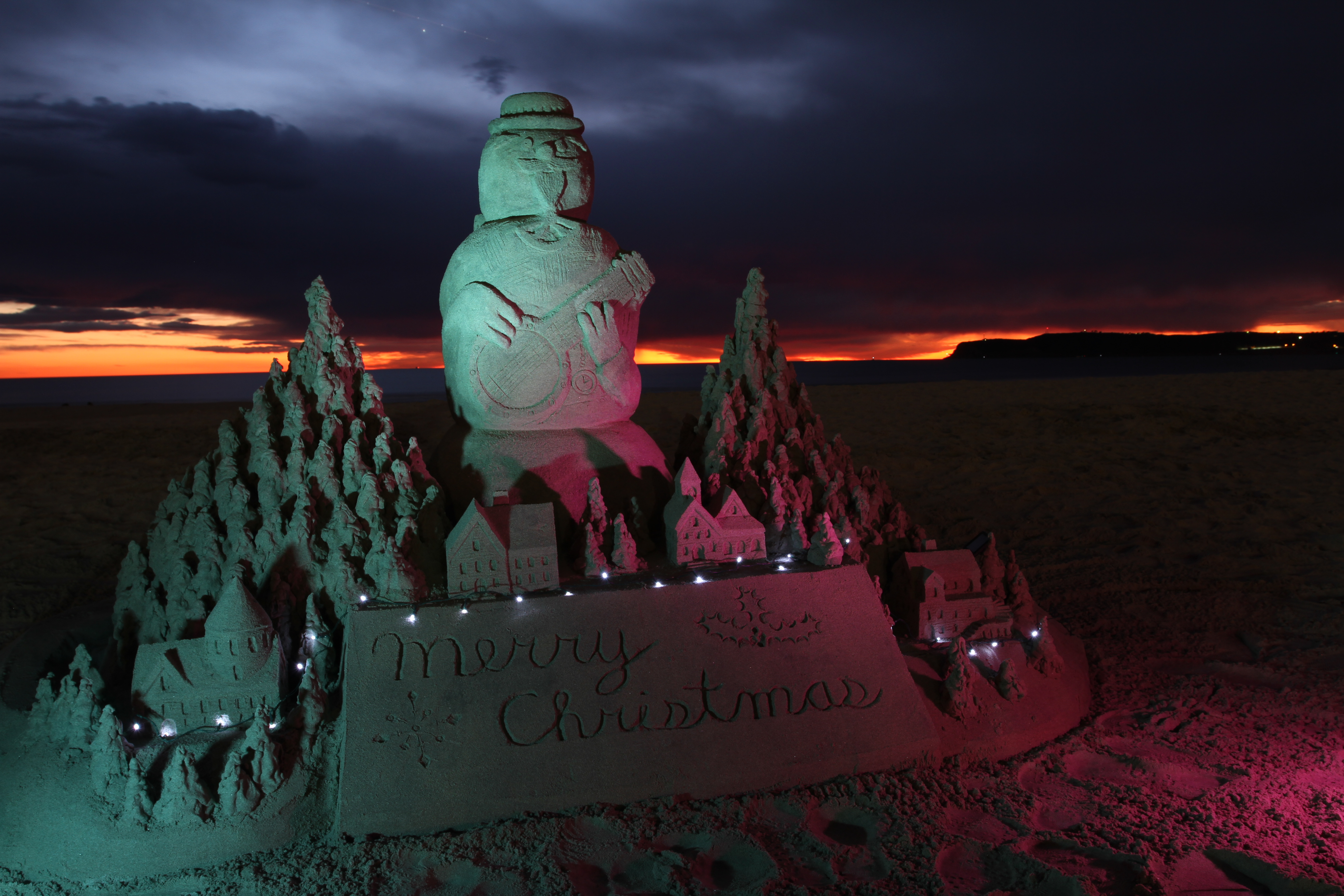 Before the water and rain bring this one to the sand, make sure to stop in to check out this amazing sand art in front of the Hotel Del. Bill Paylacka is the sand castle guru and artist and has out done himself yet again with this festive sculpture, to be enjoyed in daylight OR at night. Pay your respects and talk about sand with Bill. His work and information can be found on www.thesandcastleman.com
