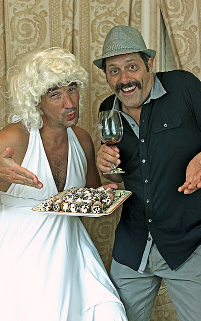 Alec’s Rat Pack Party. Nina set up a little photo booth and the boys really got into posing in the Marilyn dress and wig! Many of the photos had to be censored from the blog, but this one of Kai and Alec, with my plate of cannoli, is classic.