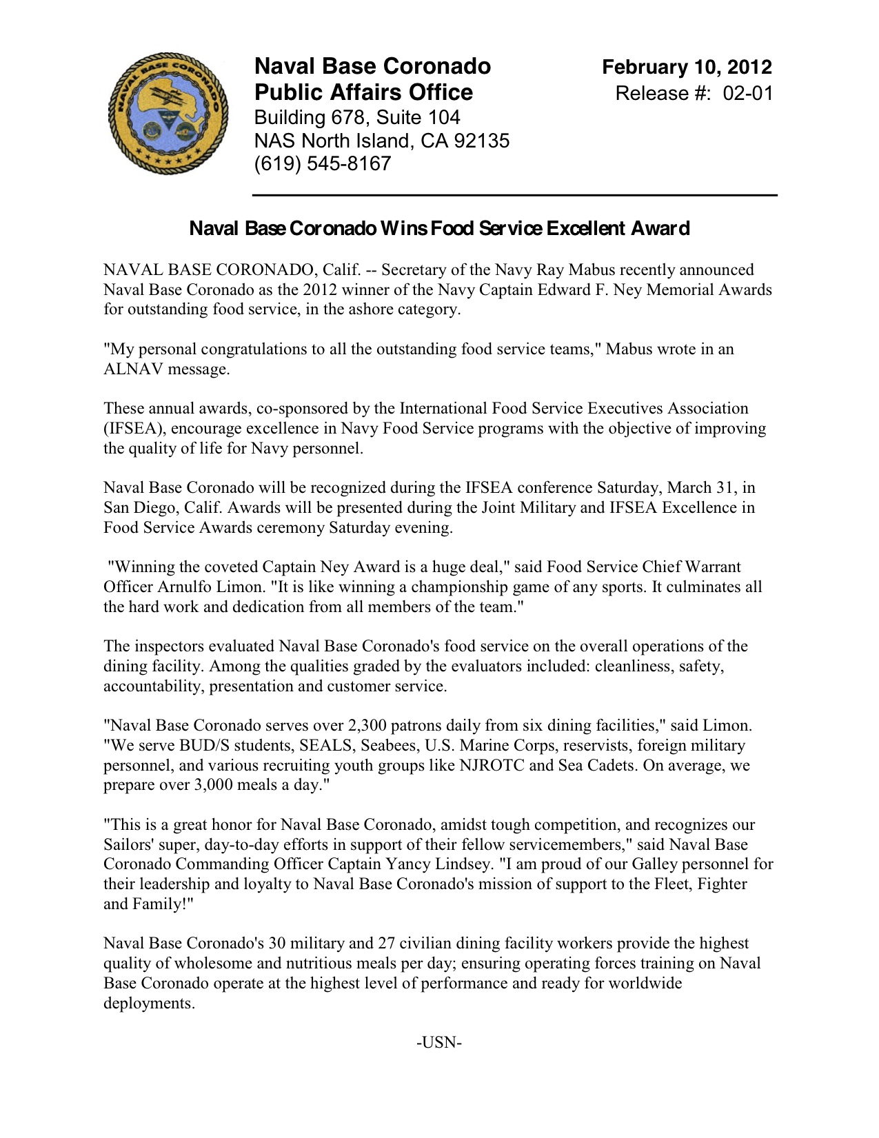 Naval Base Coronado Wins Award For Outstanding Food Service