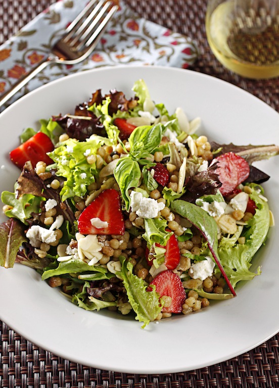 With the strawberries that made it home, we enjoyed strawberries tossed with a touch of thick, syrupy balsamic vinegar spooned over strawberry cheesecake ice cream, and the salad below which I created with baby arugula, fregola, sliced strawberries, toasted almonds, basil, and lavender honey goat cheese, tossed in a light balsamic, olive oil and tangerine juice vinaigrette. Fregola, a type of pasta from Sardinia, and similar to Israeli couscous, added a nice flavor and texture to the salad.