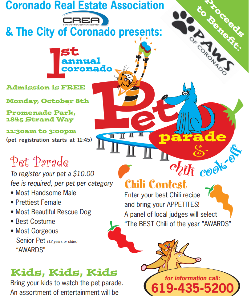 Plan on a hot time in Coronado, on Monday, October 8th, with pets & chili cooks competing for attention at the Coronado Real Estate Association & The City of Coronado.