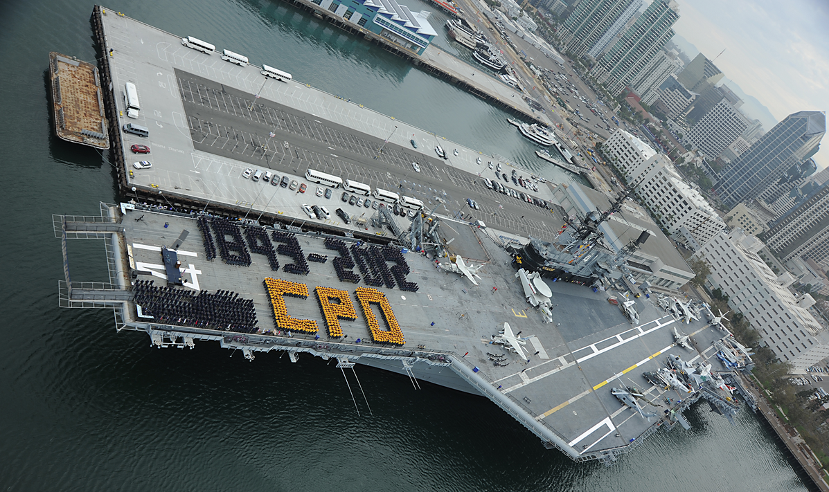 SAN DIEGO (September 5, 2012) — Over 1,700 Chief petty officers (blue shirts) and 700 chief selectees (yellow shirts) from throughout Navy Region Southwest gather on the USS Midway Museum during events held as part of San Diego’s CPO Pride Day 2012. (U.S. Navy photo by Mass Communication Specialist 2nd Class (EXW) Terrence Siren/Released)