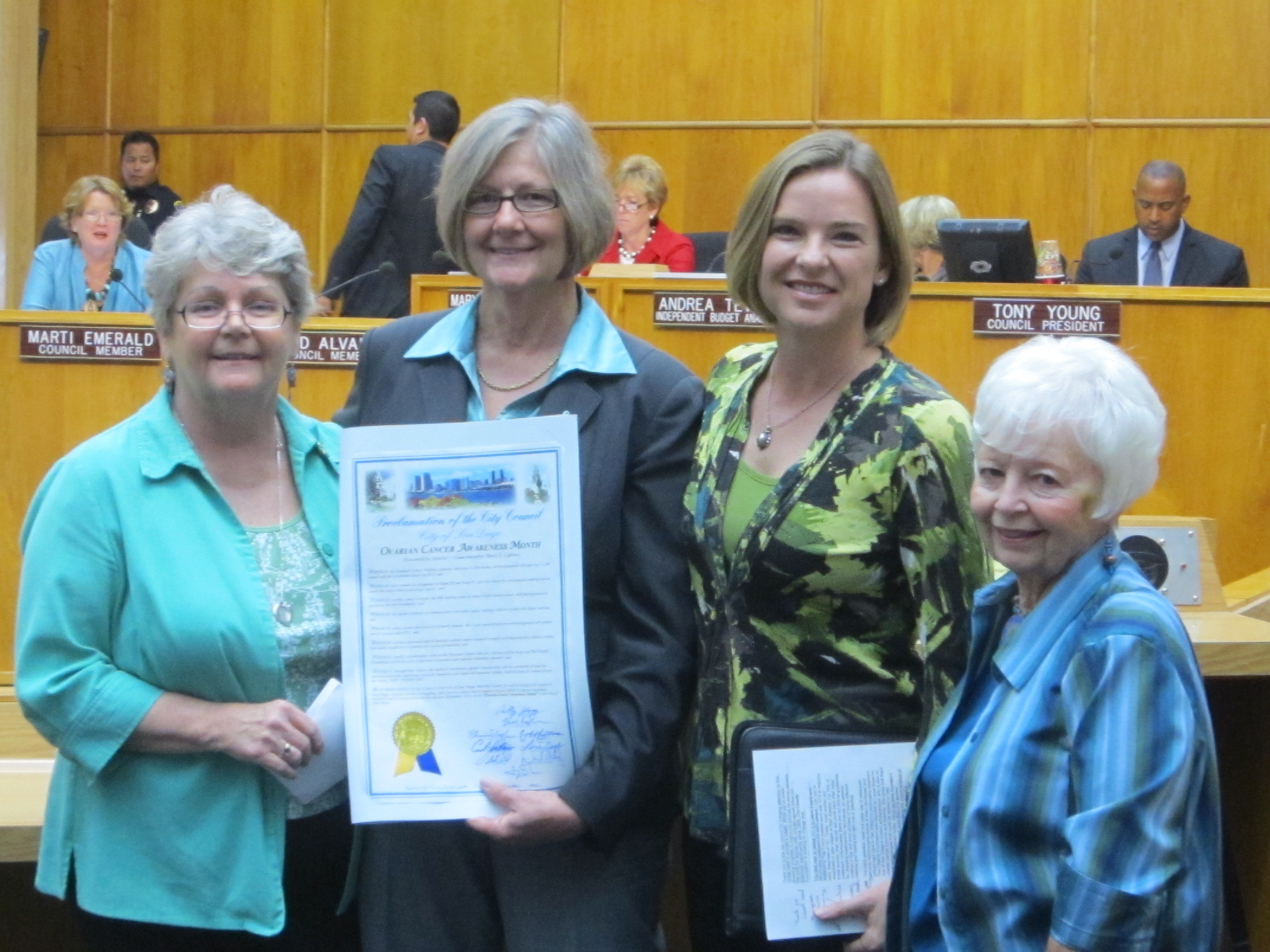La Jolla, Calif. Wednesday, September 26, 2012 Women with the most lethal gynecologic cancer and their advocates were honored yesterday at the San Diego City Council meeting when Councilmember Sherri S. Lightner presented a proclamation declaring September 2012 to be “Ovarian Cancer Awareness Month” in the City of San Diego. Lightner and fellow Councilmember Marti Emerald commended the contributions of local organizations The Clearity Foundation and the Ovarian Cancer Advocacy Alliance of San Diego for increasing awareness of the disease and advancing ovarian cancer research towards early diagnosis. Lightner lost two dear friends to ovarian cancer, known as a “silent killer” for its vague initial symptoms that make it difficult to detect until the cancer is advanced. Emerald echoed Lightner’s gratitude to the patient advocacy organizations and in a brief diversion from the formality of a usual Council meeting, reflected on the late diagnosis and loss of her favorite aunt who died of the disease.