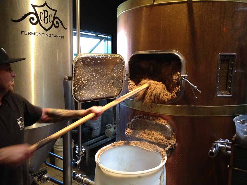 Brewer Peter Falletta unloading spent grain after a brew at the Coronado Brewing Company. Photo courtesy CBC.