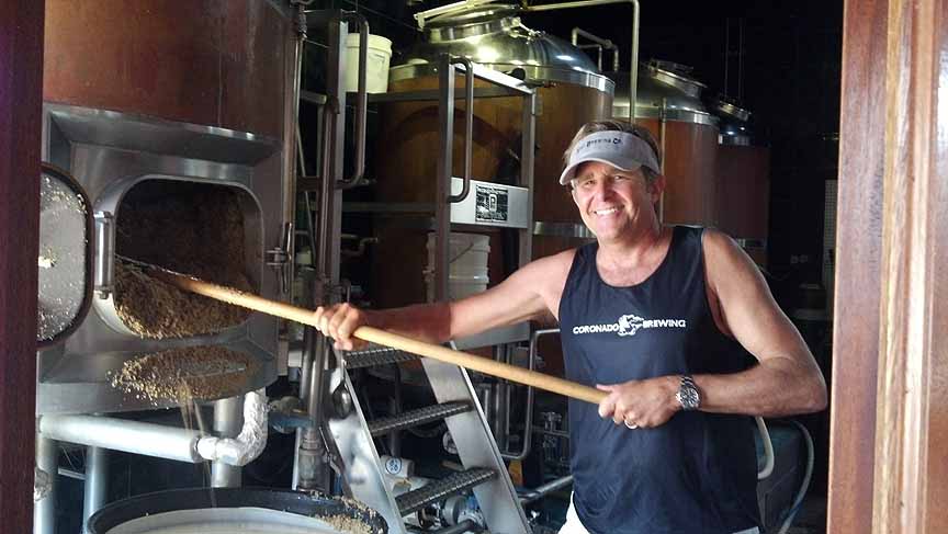Rick Chapman, co-founder of the Coronado Brewing Company, pulling grain after a collaboration
