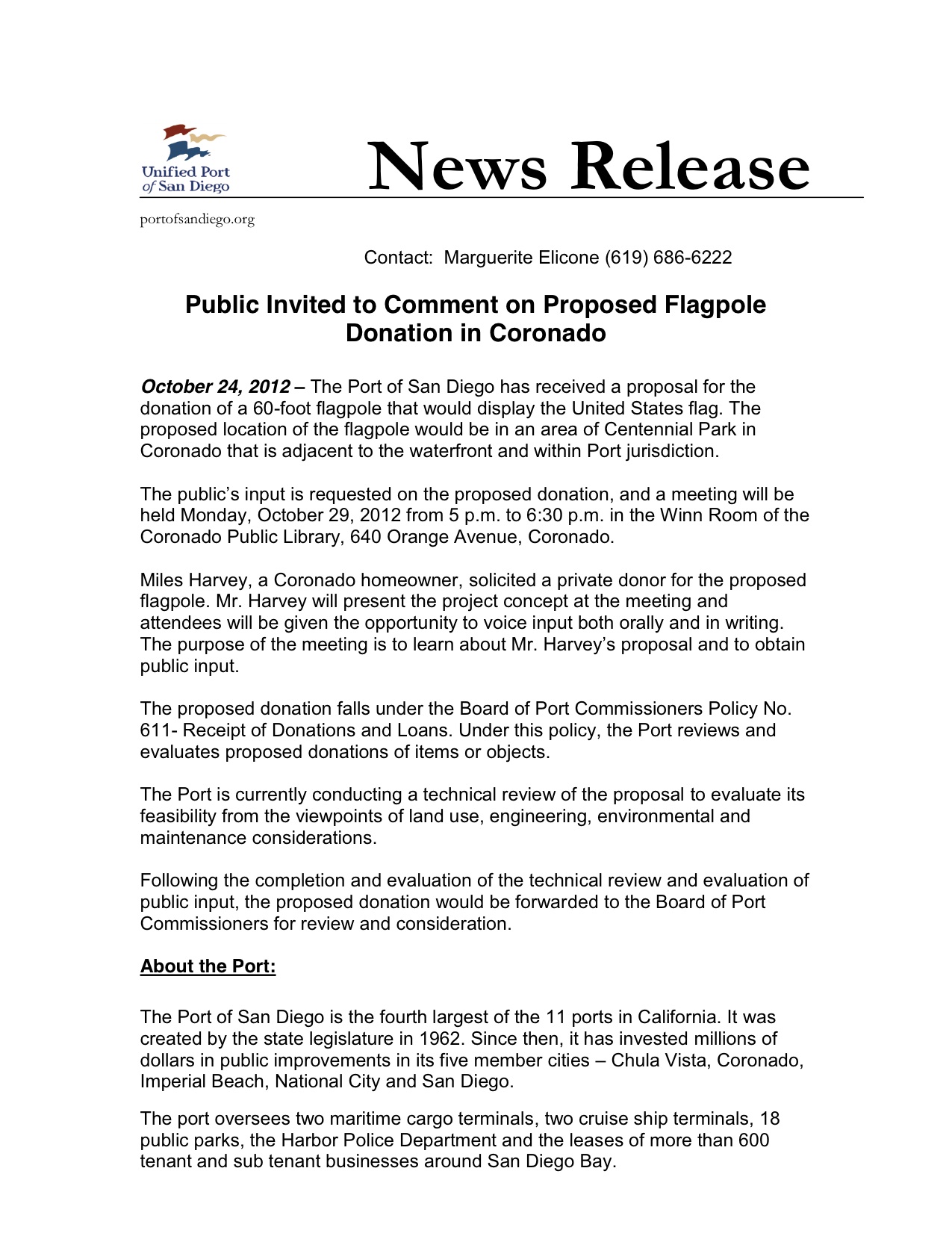 Port Invites Public Comment on Proposed Flagpole Donation Oct. 29