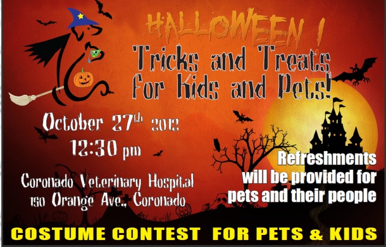 You, your family and friends and especially your PETS are invited to join us at Coronado Veterinary Hospital for some Halloween tricks and treats.