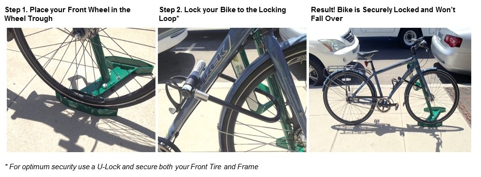 The docks also have a QR Code that links to the City’s website and a “Smart Guard” to help prevent metal to metal contact from scratching bikes. Here are some simple steps for how to use the bicycle docks: