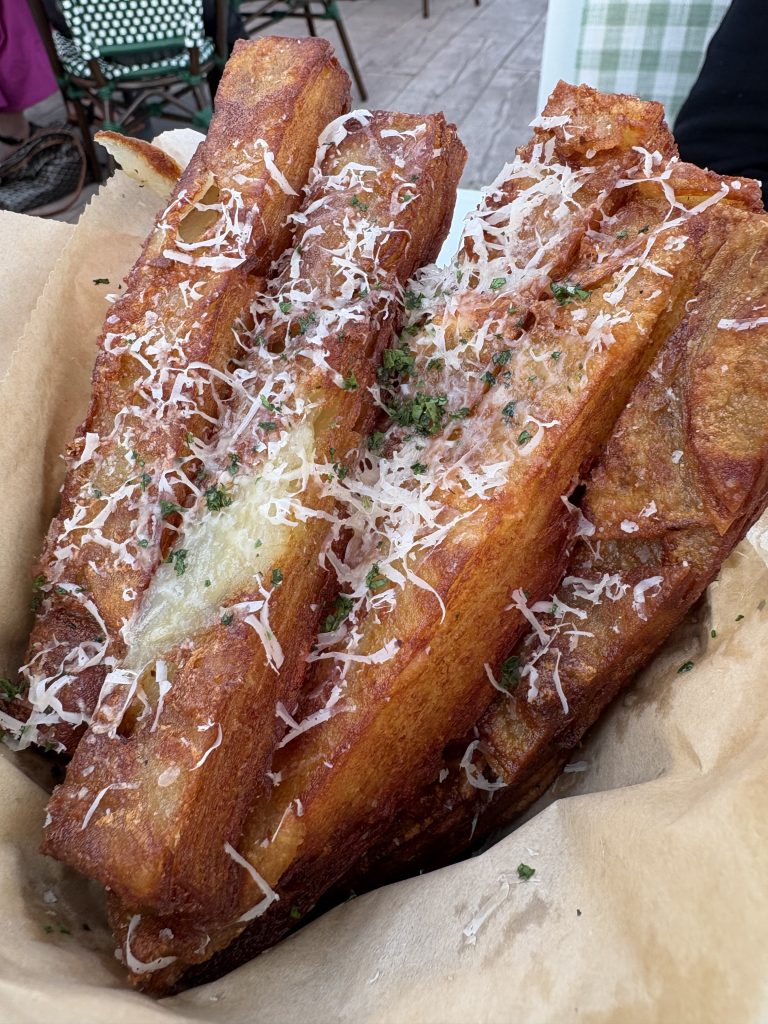The checkered green gingham fabric and patterned tile set the tone for my friend Carolyn and me to enjoy alfresco dining on a recent visit. The menu offers a wide array of appetizers from the retro Pull-apart Parker House Rolls, with cultured sea salt butter to oysters pulled from the Pacific Ocean and then broiled and served with chorizo butter and a warm baguette.