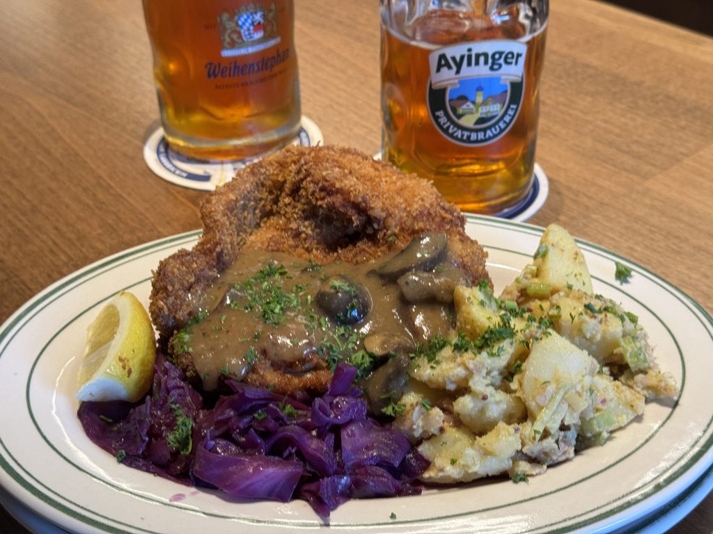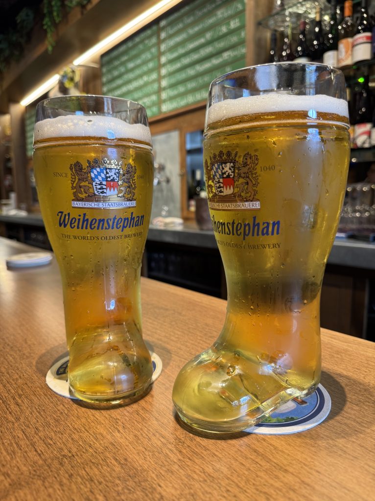 Mug in hand, we ordered our Schnitzel plate, which we planned to share between us. Biersal offers a choice of chicken or pork schnitzel; we chose the pork as it felt more authentic. When our food arrived, we decided to get into the swing of things, so we ordered a couple of boots of the house Helles Bock and tucked into them. Das Boot (English slang), or a bierstiefel in German, is a traditional German glass shaped like a boot, typically containing a liter of beer. There is a trick to drinking one of these boots; as you get about halfway through, there is a potential for mishap, but I won’t ruin the surprise. Learning the trick is half the fun.