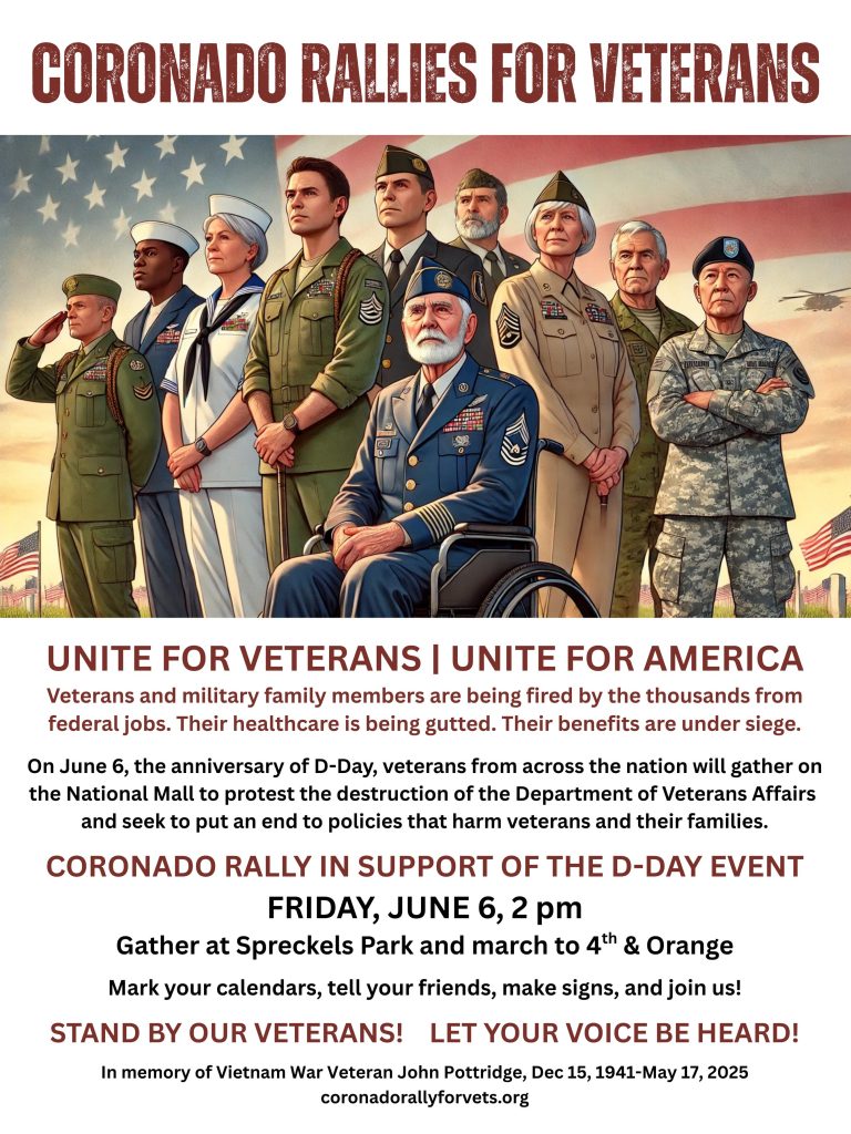 The rally is in memory of Coronado resident John Pottridge, a twice-wounded Vietnam War veteran who passed away May 17, 2025.