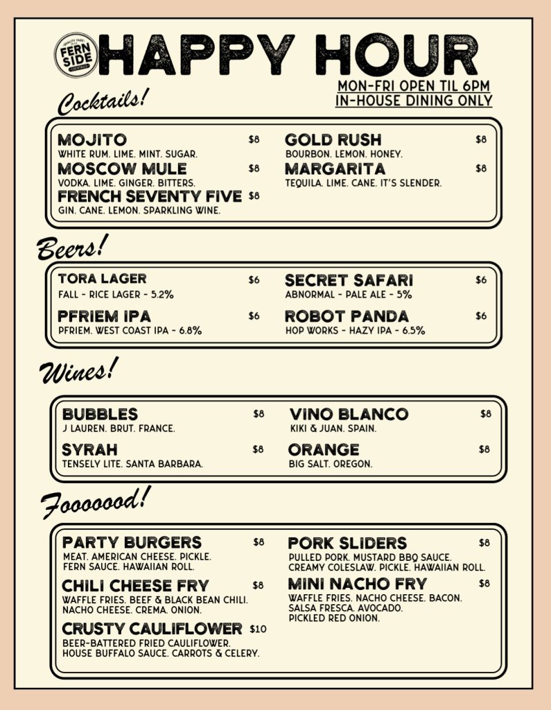 I recently went to Fernside for a burger and landed at the bar as happy hour started. During happy hour, they offer a range of discounted appetizers and drinks. I ordered the sliders and chili cheese waffle fries, which cost less than their regular burger. Happy hour runs until 6 PM Monday through Friday.