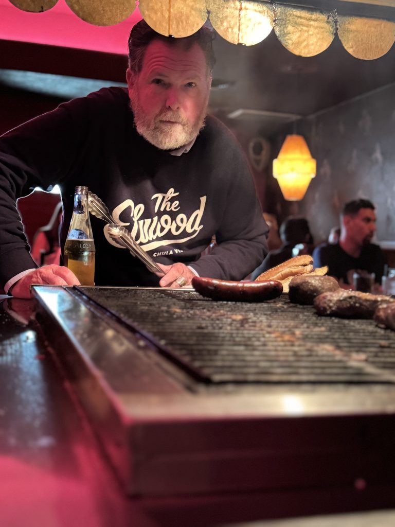 Once the food arrived, I ordered a Miller High Life, and we made our way to the grill. It was a tight fit, but the crowd ebbed and flowed. We found a corner of the grill and got to work. Once the food is cooking, you can’t help but talk with others; everything about the Turff Club is social.