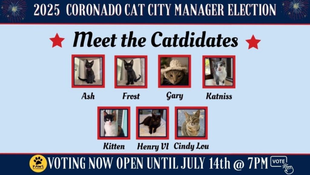 PAWS of Coronado is thrilled to announce voting for the next Cat City Manager, featuring seven charming CATdidates. This whimsical election fosters community spirit and celebrates the bond between residents and their cats, as excitement builds for the new Cat City Manager to lead PAWS of Coronado.