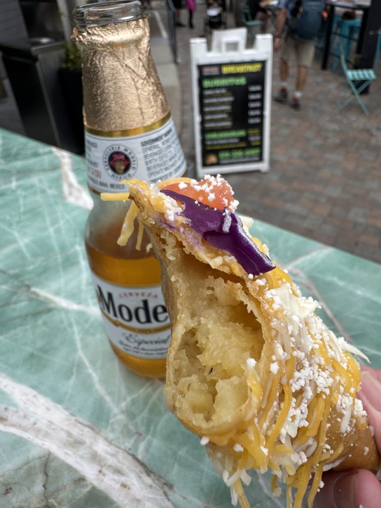 No need to worry, here is a pro tip. I took one bite out of my crisp shell potato taco, exposing the mashed potato filling. Have you ever enjoyed steak and mashed potatoes? I have, and I proceeded to use my taco to press the leftover bits of steak into every last bite of that potato taco. I alternated between bites, using a little of each of the red and green hot sauces. The cabbage and cotija cheese that topped my potato taco mixed beautifully with the steak, creating a stunning flavor combination that an ice-cold Modelo perfectly complemented.