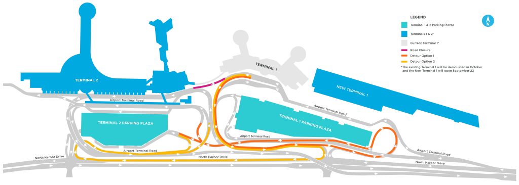 Beginning September 8, the arrivals roadway connecting Terminals 1 and 2 will close to allow safe access for construction crews to the Phase 1B construction site. Vehicles traveling between the two terminals will be redirected to alternate on-airport routes.