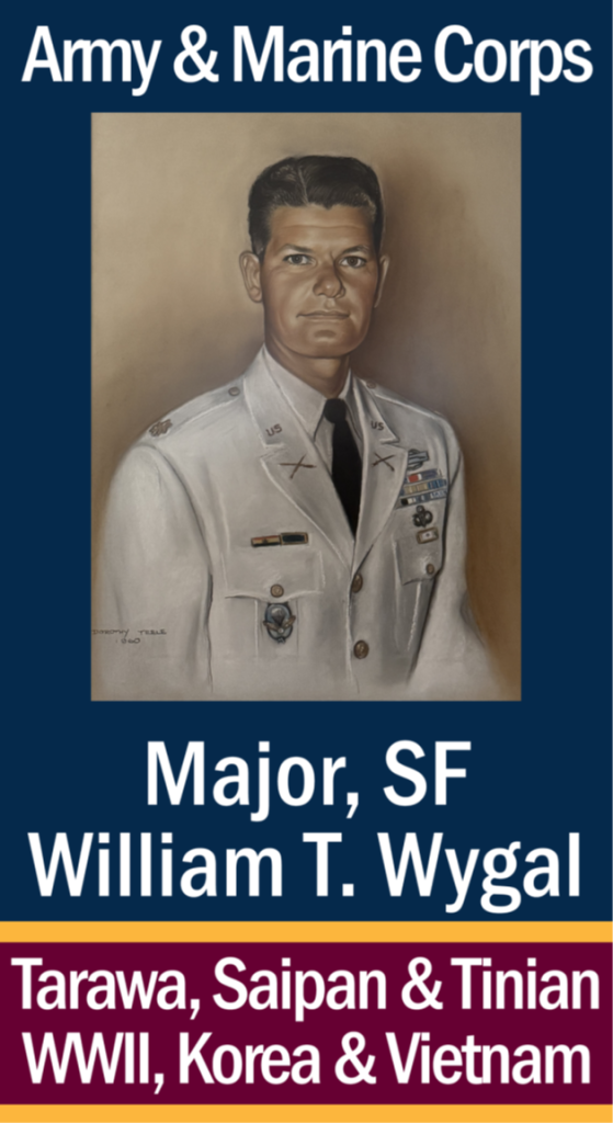 Bill enlisted in the Marines in World War II, completing basic training at MCRD in San Diego. He landed with the 2nd Marine Division at Tarawa and served in campaigns on Saipan and Tinian. Bill’s brother, Larry, played football at the University of Iowa and went on to fly B-24 Liberators in Europe. After World War II, Bill bought his first house in Coronado at 612 Ninth St., where he lived until he joined the Army, completing Officer Candidate School, Jump School, and the Infantry Officer course. He then served with the 24th Infantry Division in Japan, which led to a short tour in Korea as part of Task Force Smith. Bill served for 40 days before being wounded and evacuated to Alameda, California. After recuperating, his assignments included duty with the 504th Airborne Infantry Regiment and 10th Special Forces Group at Fort Bragg; aide-de-camp to the commanding general; attaché and parachute instructor with the Military Assistance Advisory Group in Iran; commandant of troops at the Army Language School, Presidio of Monterey; advisor to the South Vietnamese Army with the Military Assistance and Advisory Group in Vietnam; infantry operations officer in Baumholder, Germany; and executive officer with the 2nd Armored Division at Fort Hood, Texas.